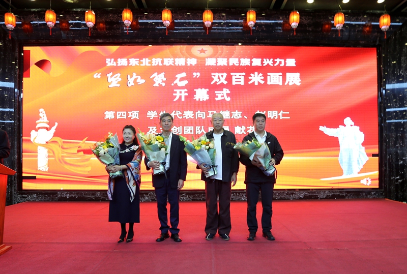 开幕式由吉林体育学院党委副书记郭世强主持。省委宣传部二级巡视员杨红军,省教育厅党组成员、省委教育工委专职副书记方向春,吉林体育学院党委书记董亮,党委副书记、校长邵桂华,磐石市委常委、宣传部部长李瑞淞,双百米组画主创人、人民大会堂特约画家赵明仁先生;人民英雄杨靖宇将军之孙、吉林体育学院客座教授马继志先生等领导、嘉宾出席开幕式,部分在长高校师生代表共同见证开幕盛况。
